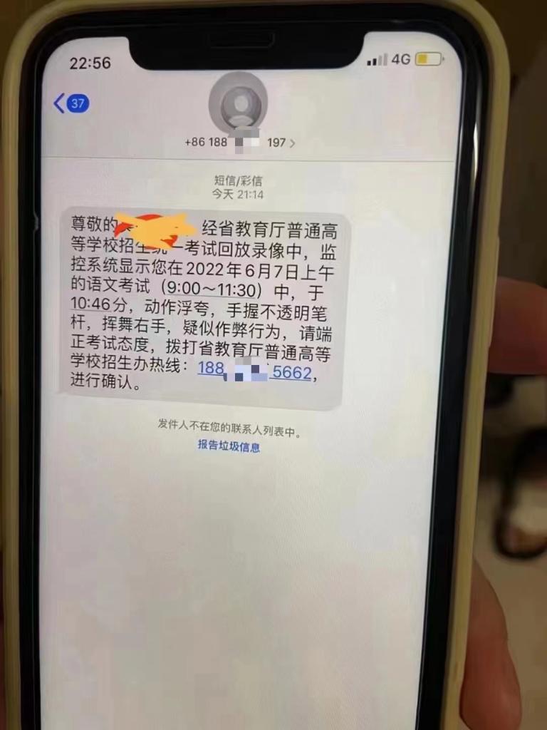“尊敬的考生×××,经省教育厅普通高等学校招生统一考试回放录像中,监控系统显示您在2022年6月7日上午的语文考试(9:00—11:30)中,于10时46分,动作浮夸,手握不透明笔杆,挥舞右手,疑似作弊行为,请端正考试态度,拨打省教育厅普通高等学校招生办热线:188×××进行确认。”近日,有考生向厦门警方反映,自己接到了声称是“省教育厅普通高等学校招生办”的通知短信,怀疑是诈骗信息。该短信在开头准确写明了考生姓名,并在结尾要求考生主动拨电话号码进行确认。经与教育部门核实确认,高考作弊违规行为不会以短信、电话、链接等方式通知。厦门警方提醒,不法分子通过非正常渠道搜集到考生信息,并向考生发送所谓“疑似作弊”的通知短信,考生一旦回拨电话,就可能被不法分子以“处理作弊行为”为由实施诈骗。