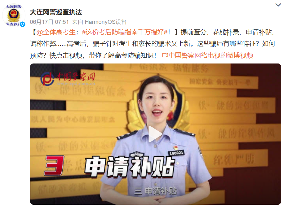 针对上述四种诈骗类型,厦门市打击治理电信网络新型违法犯罪中心民警洪恒亮表示,部分考生及家长“病急乱投医”的焦虑心理和一些孩子希望尽早为家庭减轻经济负担的迫切需求使得上述精准诈骗得以有机可乘。不法分子通过看似专业的短信或电话通知,再辅以以假乱真的“证明材料”,具有一定的迷惑性。