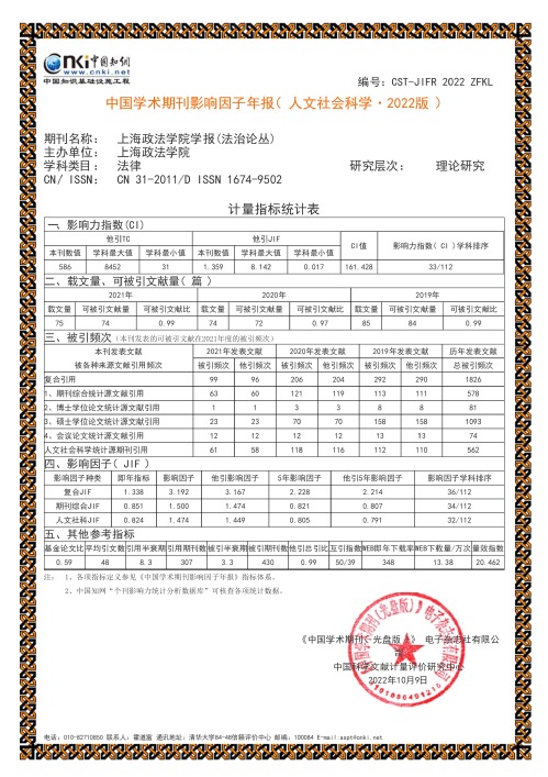 近日,中国知网发布了《中国学术期刊影响因子年报(人文社会科学2022版)》。数据显示,《新利18官方客服学报(法治论丛)》“复合影响因子”从2021年的2.428上升到2022年的3.192;综合影响因子从2021年的1.048上升到2022年的1.500;“影响力指数(CI)”学科排序也从2021年第41位上升到2022年第33位。三项指标进步明显。