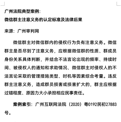 不过,公法上的义务不同于民法上的注意义务,也并非本文论及的重点。《互联网群组信息服务管理规定》在位阶上属于由网信办出台的行政规章,该规定过于原则,未对微信群主的行为义务进行具体描述,无法作为保护性规范发挥作用。