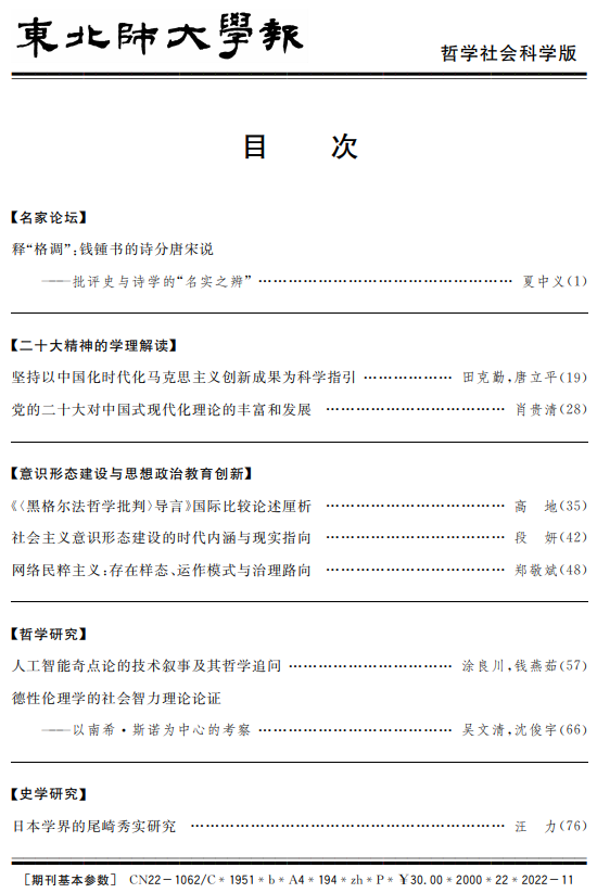 [原刊信息] 吴文清,沈俊宇.德性伦理学的社会智力理论论证——以南希 · 斯诺为中心的考察[J].东北师大学报(哲学社会科学版),2022(06):66-75.