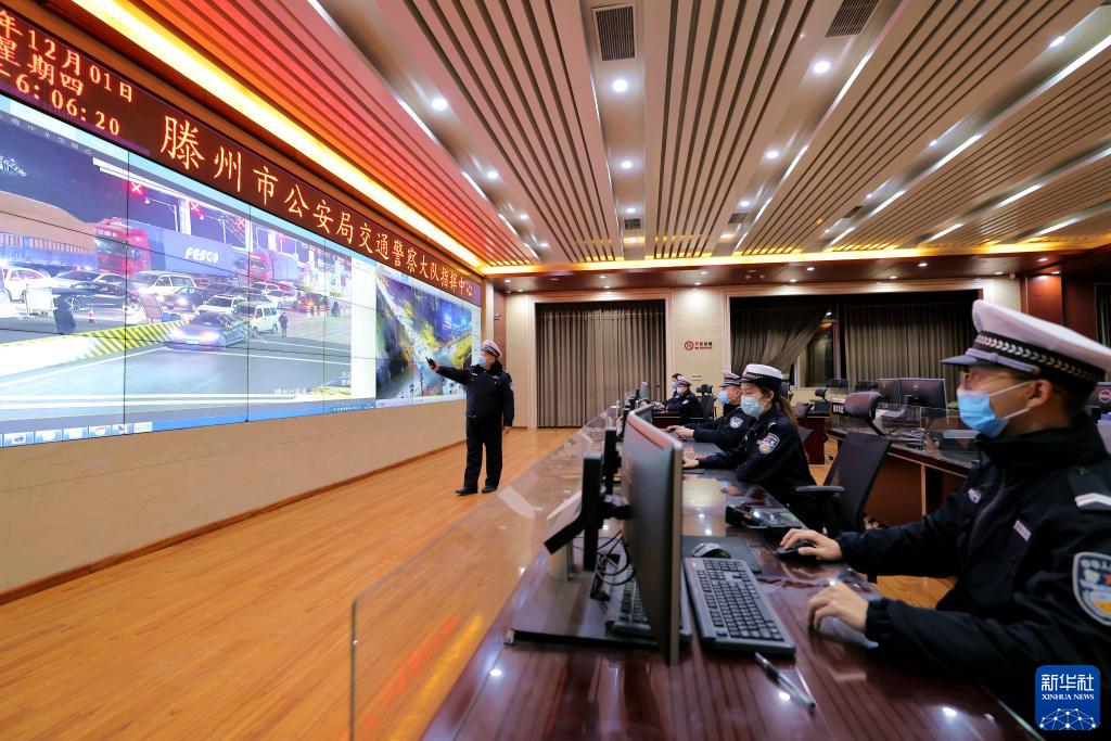 12月1日,在山东省滕州市公安局交警大队指挥中心,借助“情、指、勤、督”一体化智慧交通管理平台,民警对各个路口及路段交通流数据进行综合分析。新华社发(钟自增 摄)