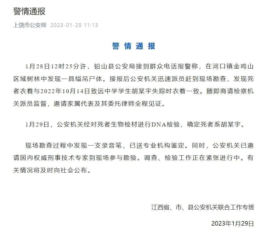 备受关注的胡鑫宇事件有了最新进展。据相关部门发布的警情通报显示,1月28日,在河口镇金鸡山区域树林中发现一具缢吊尸体。1月29日,公安机关经对死者生物检材进行DNA检验,确定死者系胡某宇。