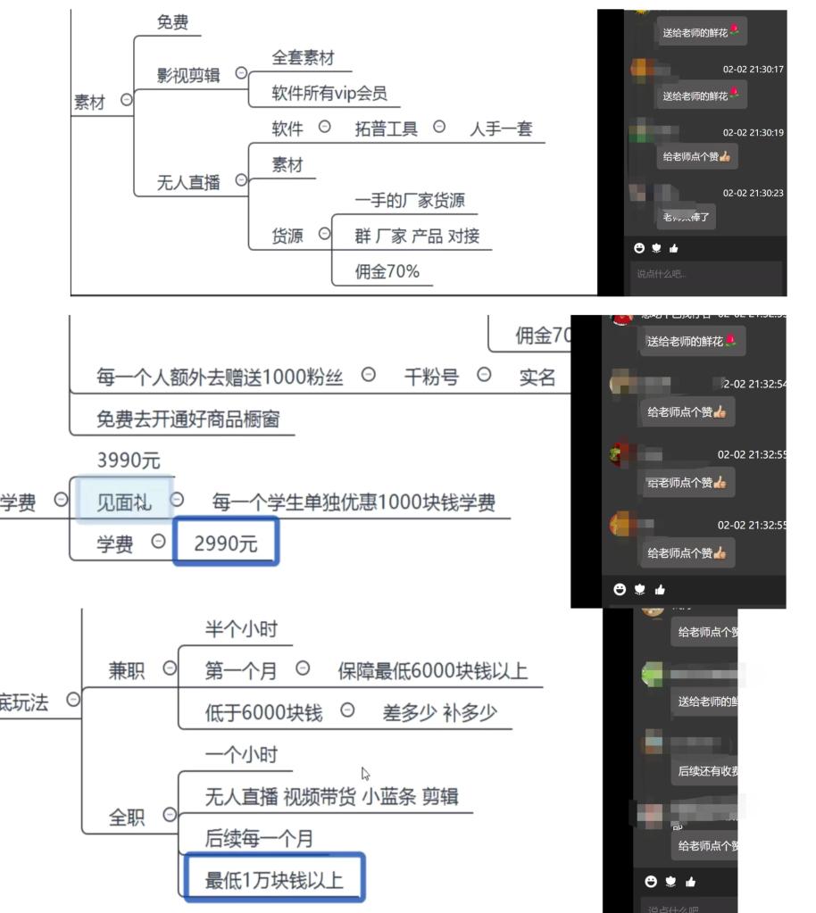 课程快结束时,该“讲师”表示可为15位学员进行“一对一”授课,不仅能“手把手”教会各类变现技巧、免费赠送粉丝、对接带货货源,还许诺如果学员全职从业,从第二个月起每月收入将不低于1万元,但需要付课程费2990元。有部分学员付了款。