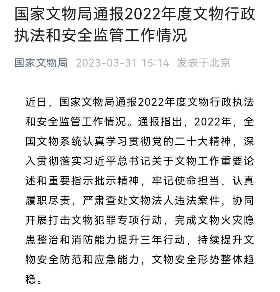 国家文物局近日通报2022年度文物行政执法和安全监管工作情况。通报显示,国家文物局直接督办文物违法案件124起,“12359”文物违法举报平台受理文物违法举报问题线索106件,一批群众举报的文物违法案件得到依法查处。
