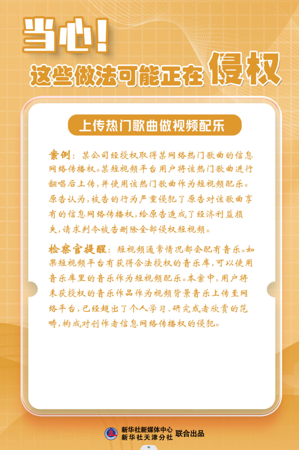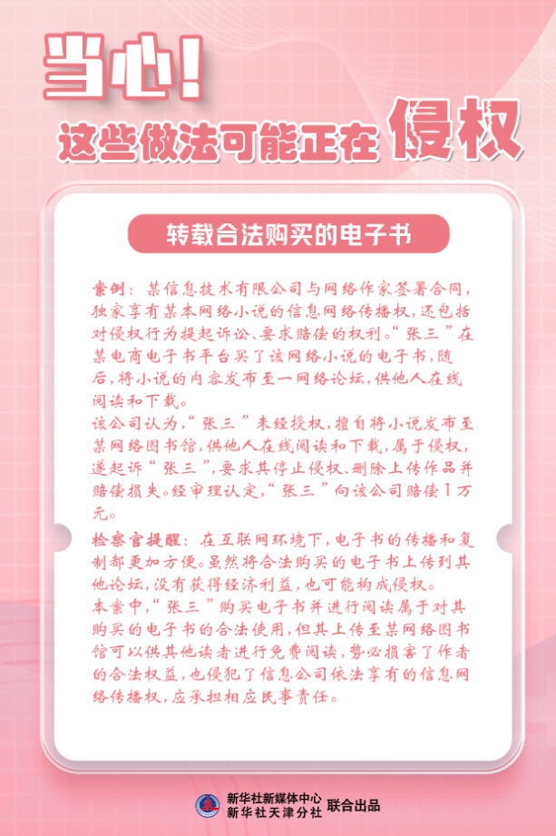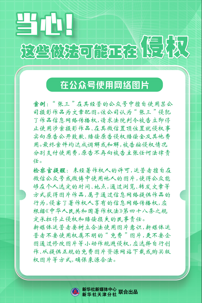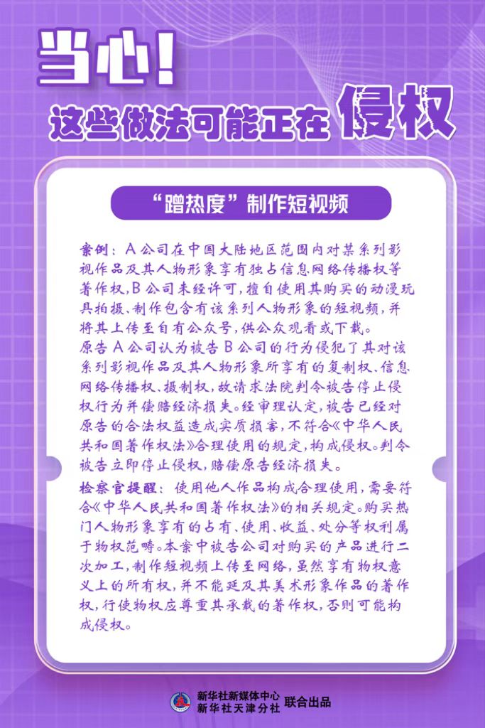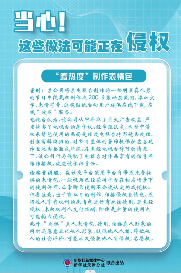 新华社天津4月26日电(记者尹思源)“知识产权”与每个人都息息相关。4月26日是“世界知识产权日”,天津市人民检察院第二分院检察官郭膳溥提醒,恶搞图片、转载图书、视频配乐……这些生活中常见的做法可能构成侵权!