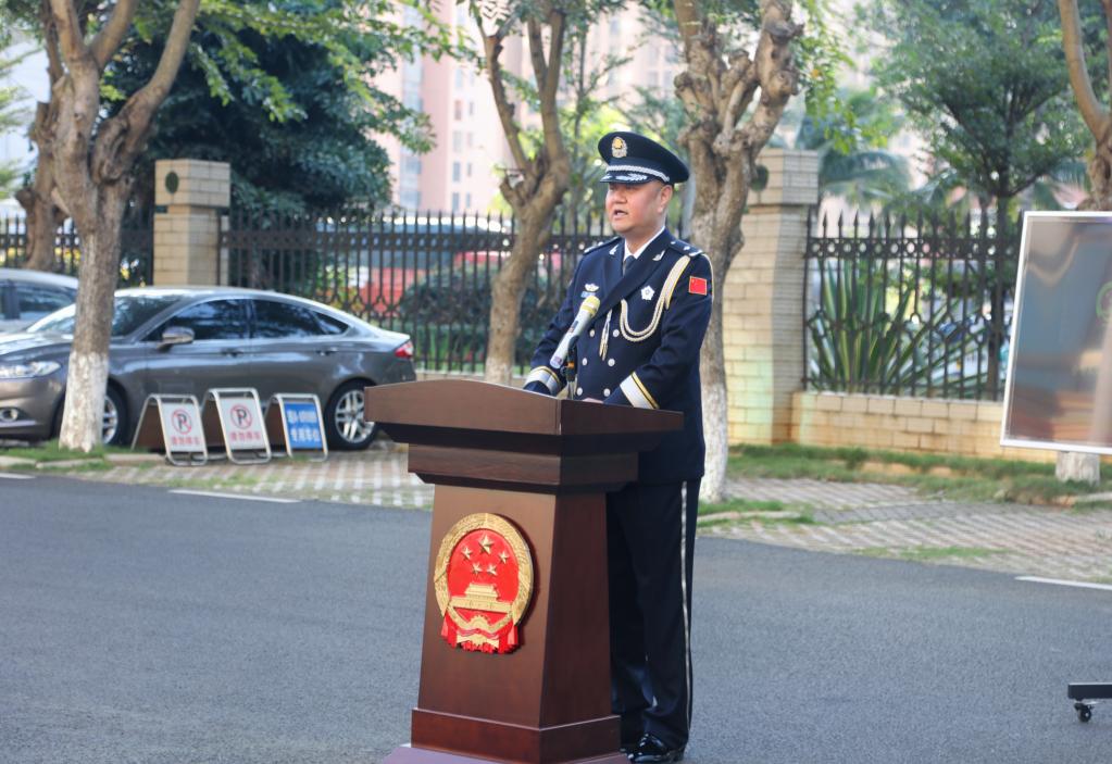 图为2021年12月4日,陈旭在海南省府城强制隔离戒毒所主持宪法宣誓活动。
