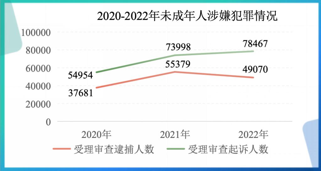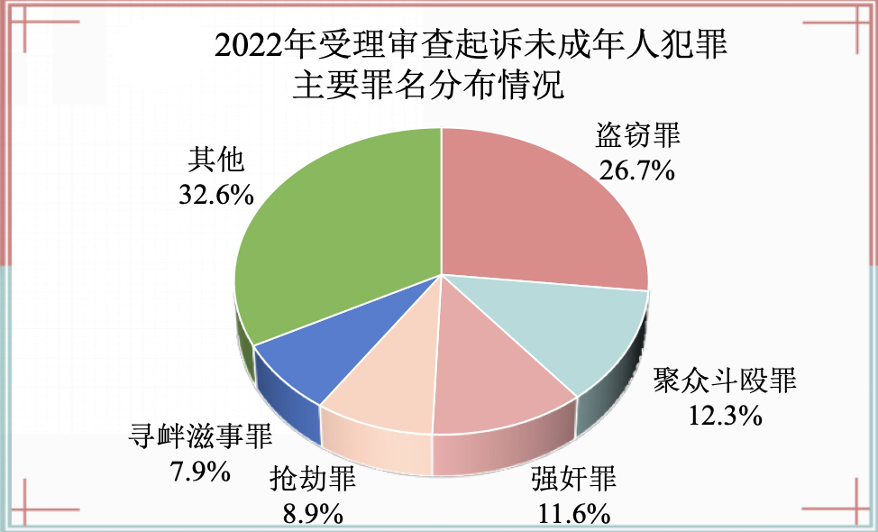 白皮书公布的未成年人检察办案数据显示,未成年人犯罪总体呈上升趋势。2022年受理审查逮捕、受理审查起诉人数较2020年分别上升30.2%、42.8%。2022年检察机关受理审查起诉未成年人犯罪居前五位的分别是盗窃罪、聚众斗殴罪、强奸罪、抢劫罪、寻衅滋事罪,占比共达67.4%,未成年人犯罪类型更加集中。