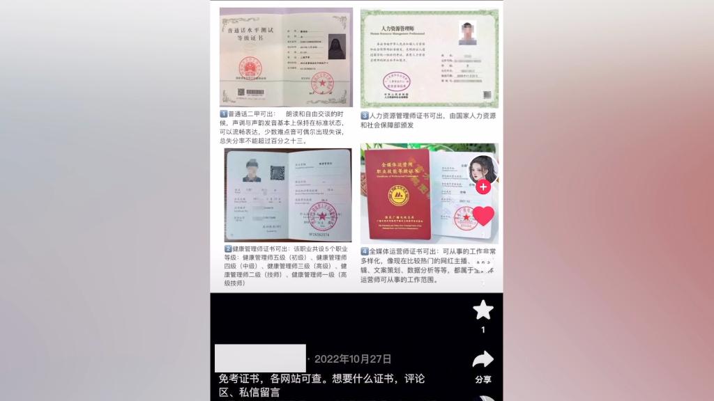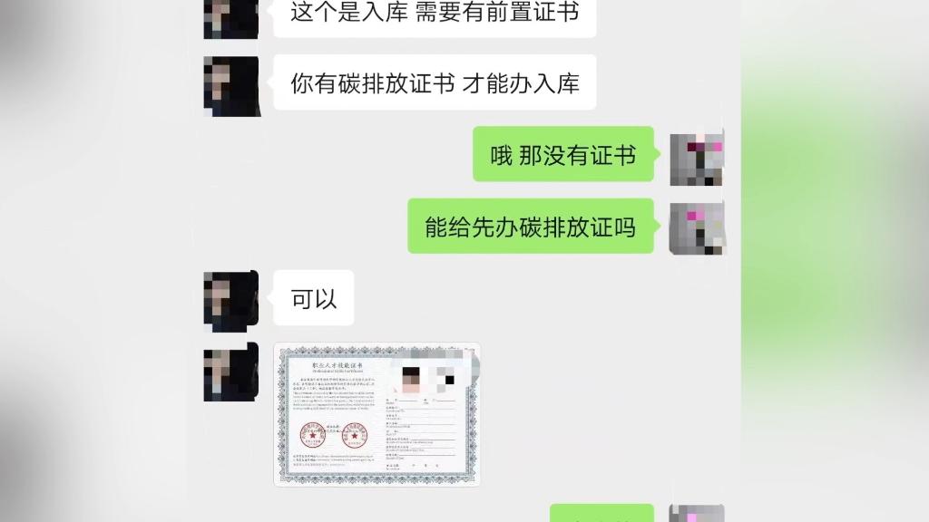 “证书作坊”的不法分子通过“免考办证”“证书挂靠”“证书入库”等名义骗取受害人的钱财。记者以“需要办证”的名义找到一家自称是“源头证书办理”的微商,他称可以无需考试就办理“全国职业信用评价网”所颁发的“碳减排领域人才入库证书”,每张500元。