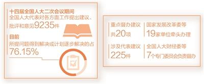 据全国人大常委会代表工委负责人介绍,十四届全国人大二次会议期间,全国人大代表依法履职尽责,对各方面工作提出建议、批评和意见9235件,交由213家承办单位研究办理,其中,重点督办建议共20项。