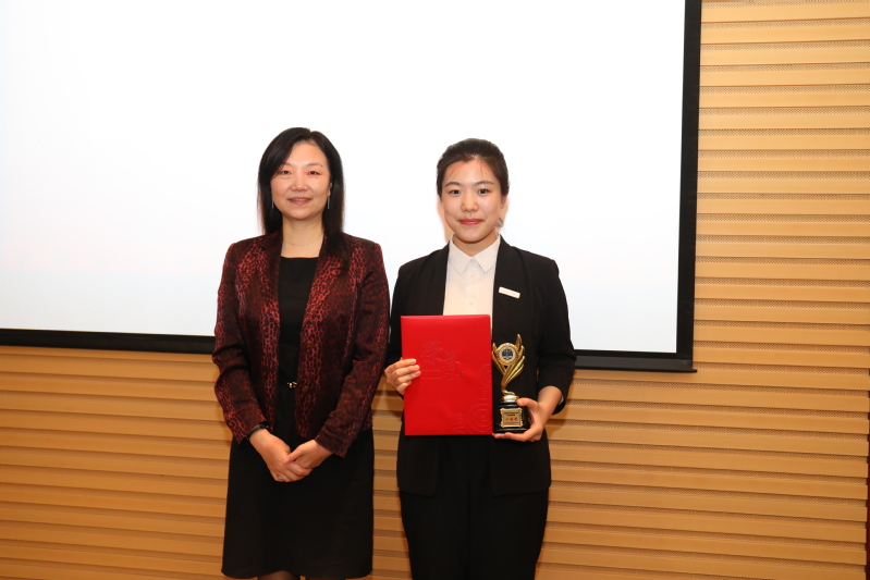 本次竞赛,陈丹彤同学被授予全国赛最佳辩手称号。刘晓红为陈丹彤颁奖。陈丹彤作为校队队长和最佳辩手发言。