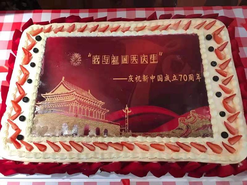 师生代表在生日蛋糕前合影留念,共同为伟大的祖国送上诚挚的祝福。