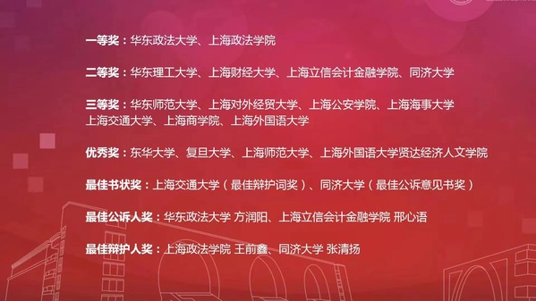 本届赛事,我校同华东政法大学获得本次赛事的一等奖,同济大学、上海立信会计学院、华东理工大学、上海财经大学获得二等奖。