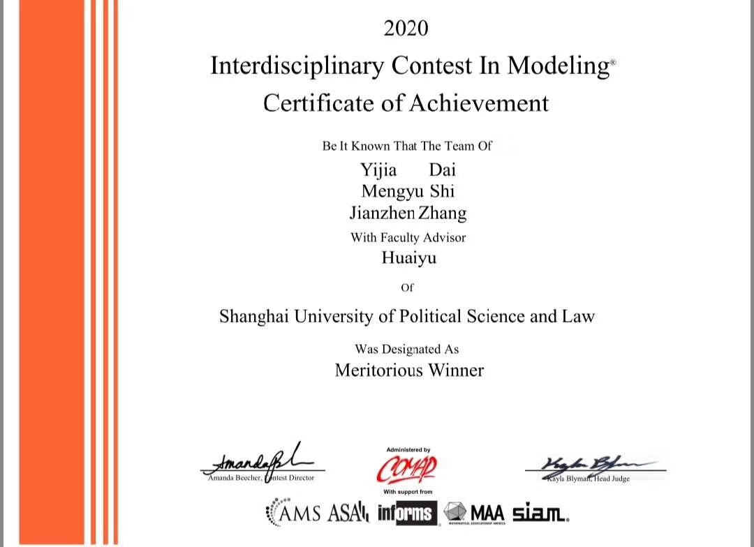 日前,2020年美国大学生数学建模竞赛评审结果正式公布,我校经济管理学院代表队(学生戴亦嘉、史梦妤,指导老师何怀玉荣获一等奖Meritorious,创下我校历史最好成绩。