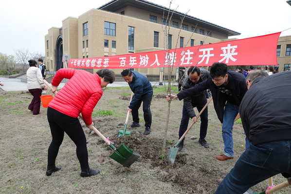 植树活动一开始,校领导就带领师生扛起铁锹,走向植树地点,和大家一起挥锹铲土、扶苗培土、围堰浇水,忙碌了起来。校领导一边劳动,一边同身边的师生交流加强生态保护、坚持绿色发展的看法,叮嘱大家养成爱护自然、保护环境的意识,用自己的双手把校园建设得更加美丽。