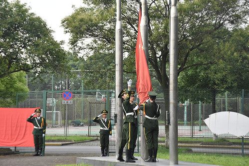 迎着清晨的朝阳,由学校军魂团学生组成的国旗护卫队,护送着鲜红的国旗,昂首阔步走向国旗台。伴随着雄壮的国歌声,鲜艳的五星红旗冉冉升起,500余名师生怀着无比崇敬的心情向国旗行注目礼,表达“请党放心、强国有我”的豪情。