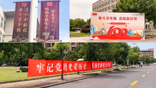 在学校师生的朋友圈里,一条“我们在上政,祝福伟大的中国共产党生日快乐!”的微信推送在清晨刷屏网络,不到两小时,点击量便过万。除此之外,校园里随处可见的横幅、道旗、展板,校园网上的大幅图片,让“野马浜”披上节日的盛装。