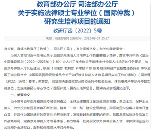 近期,教育部办公厅、司法部办公厅联合印发《关于实施法律硕士专业学位(国际仲裁)研究生培养项目的通知》(教研厅函〔2022〕5号),选取全国20所高校承担这一新型培养项目,我校名列其中。这是继2021年法律硕士专业学位(涉外律师)研究生培养项目后,我校再度承担的重要研究生培养项目。