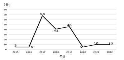 聚焦190份“一带一路”建设软法文件,首先在签订数量上如图1所示,其总体呈现出上升回落趋势。其中2015—2016年均处于低位徘徊,均量为每年5份。而自2017年开始,中国对外签署的“一带一路”软法数量实现大幅度攀升并达到了68份之多。尽管2018年数量回落至41份,但2019年数据则有所回暖并较之去年增长5份达到46份,总体上2017—2019年,中国对外签署的“一带一路”建设软法基本处于高位运行阶段。但进入2020年起,数据再次大幅回落至5份,至2021年数据有所回升至10份。在2022年上半年也已达到10份,总体呈现出一种上涨的趋势。