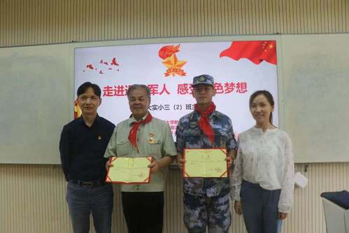 班会伊始,丁韦老师代表学校对两位退役军人的到来表示欢迎。上海交通大学附属实验小学书记兼副校长曹忠伟、校大队部主任杨永茹共同为两位嘉宾颁发聘书。谭向东和龙行受聘为“交大实小红色教育校外辅导员”。班级学生代表为两位退役军人佩戴红领巾、校徽并敬献鲜花。主题班会在孩子们一片热烈的掌声中开始。