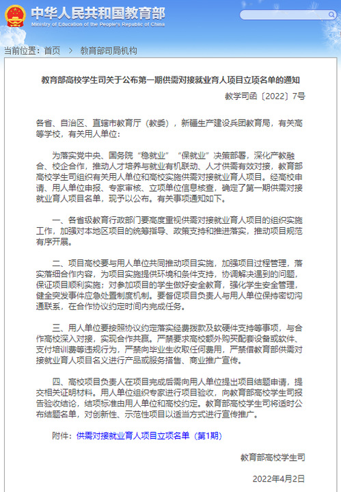 教育部供需对接就业育人项目,是落实党中央、国务院“稳就业”“保就业”决策部署,深化产教融合、校企合作,推送人才培养与就业有机联动、人才供需有效对接的重要举措。该项目分为定向人才培养培训、就业实践实习基地建设、人力资源提升三类。定向人才培养培训项目由用人单位与高校协同制定培养方案,实施长期系统定向培养(1学年及以上)或短期就业能力培训(1学期或数周),为用人单位输送急需紧缺人才。就业实践实习基地建设项目由高校与用人单位共建就业实践实习基地,为高校毕业生提供实习岗位,帮助毕业生通过实习实现就业。人力资源提升项目由高校和用人单位建立定向合作关系,共建人才工作站或专门人才基地,建立紧密的人才供需对接关系。