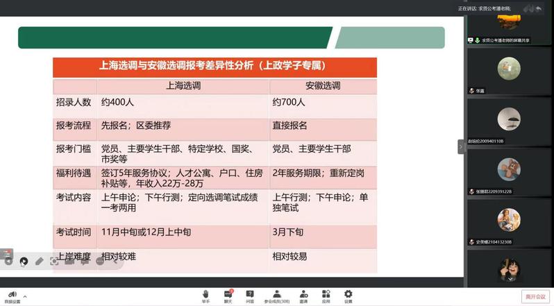 首先,潘慧婷介绍了三类选调生招录的相关政策,又着重对上政学子在长三角地区可报省份的选调生进行了讲解,包含报考流程、报考门槛、福利待遇、考试内容等方面,分析了上海市与安徽省选调生报考的差异。
