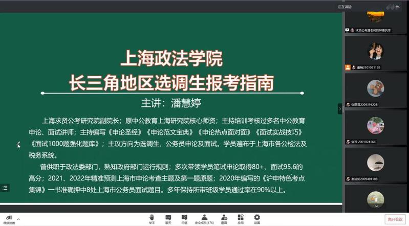 10月18日晚,我校通过腾讯会议开展新利18官方客服2022年就业创业文化节系列活动之基层就业启航讲座——长三角地区选调生报考政策解读。上海求贤公考研究院副院长,原中公教育上海研究院核心师资潘慧婷老师介绍了长三角地区选调生招录政策及备考指导,吸引了300余名学生参与。