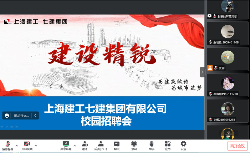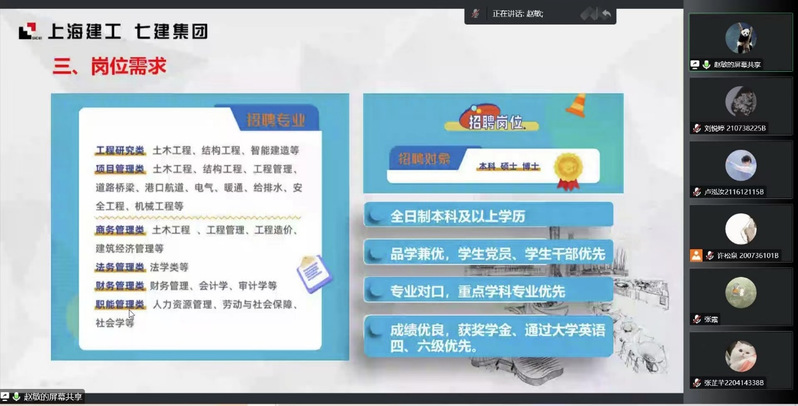 1025日上午,我校通过腾讯会议开展了上海建工七建集团新利18官方客服专场宣讲会。上海建工七建集团招聘主管赵敏介绍了上海建工七建集团招聘岗位情况活动吸引了200余名同学参与。