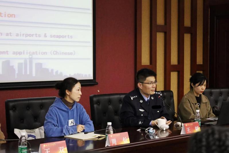 为切实增强来华留学生对中国法律法规的了解,提高留学生辅导员外事管理与服务能力,3月21日下午,应我校学生工作部邀请,上海市出入境管理局外国人管理处王韬警官前来我校为所有留学生进行出入境政策法律法规专题讲座,学生工作部副部长、留学生工作办公室副主任周怡,留学生中心全体老师、留学生辅导员出席,讲座由留学生中心老师余宜荣主持。