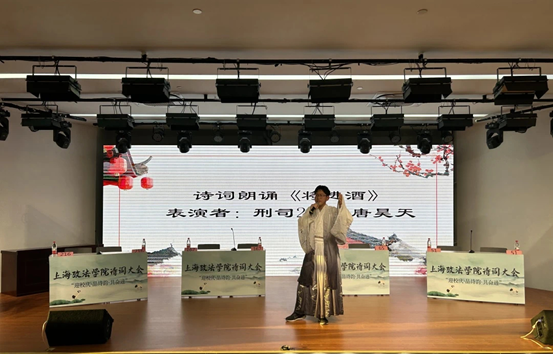 在四轮答题比拼中,各位参赛选手神思敏捷、各显神通,比分交替领先,现场氛围紧张激烈。国际法学院的杜晨昕同学和法律学院的董泽岳在比赛间隙为大家带来了民乐合奏《浮光》节目,选手和观众在竹笛与二胡的合奏中一同品味传统文化的韵味;来自刑事司法学院的唐昊天同学为大家带来了词朗诵《将进酒》,展现了诗仙李白的诗韵风采。现场观众也积极参与到诗词大会现场互动活动中。