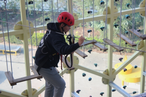 下一环节,大家进入了身后的“蜂巢塔”,准备开启新一轮的冒险。一番准备后,“全副武装”的众人,带着紧张与期待,走上了惊险的攀登道路。走过空中的平衡木,跨越摇晃的木板桥,攀过狭窄的绳索网,大家不畏艰险,一步步向前、向上,亦不忘等待落后的伙伴,以温暖的言语带给他们前进的勇气与力量。易班同学们挑战了自我,在同行的伙伴的一声声加油鼓励之声中一路披荆斩棘、过关斩将,通过了一个个刺激惊险的关卡。