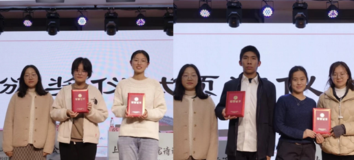 最终,根据各参赛队伍决赛得分,“泛彼柏舟队”获得一等奖,“对对队”、“走来走去队”获得二等奖,“碎叶冬青队”获得三等奖。另在复赛有2支队伍获三等奖和4支队伍获优胜奖。学工部学生易班发展中心谢涛丽老师、马克思主义学院易班工作站指导老师杜浩和语言文化学院易班工作站指导老师张宇洋分别为一、二、三等奖队伍颁奖并合影留念。