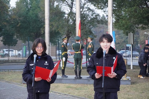上午720分,升旗仪式正式开始。随着雄壮激昂的《义勇军进行曲》,观礼师生集体肃立,齐唱国歌,校国旗护卫队成员神情庄严地护送五星红旗冉冉升起。