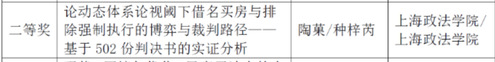 其中,来自我校经济法学院的陶菓和种梓芮报送的论文《论动态体系论视域下借名买房与排除强制执行的博弈与裁判路径——基于502份判决书的实证分析》获得本次比赛二等奖。来自人工智能法学院的林瑶瑶、李阳阳、倪佳婷报送的论文《帮信罪中检察机关不起诉适用条件的规范与完善研究——基于2820份不起诉决定书》、来自国际法学院的马梓展以及经济法学院的陈小乙、李霆威共同报送的论文《基于590份裁判文书的平台经济下新就业劳动者劳动关系认定及权益保护问题实证研究——以外卖骑手为例》获得比赛三等奖。