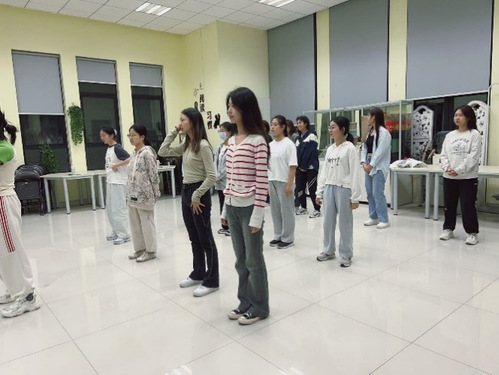 在课程开始之前,舞蹈小老师邓平平先对大家进行了简单的了解,同时也加深了彼此之间的印象。音乐响起,同学们在老师的带领下做着燃烧卡路里的热身运动和核心训练,看起来简单的动作却与后续的舞蹈内容息息相关,不少同学也已经在热身运动中伸展身体、拉伸肌肉,得到了身心的放松。通过组合练习,让学生们的身体和情绪适应课堂训练的准备,避免用力过度,从而更好的服务于下面的舞蹈练习。
