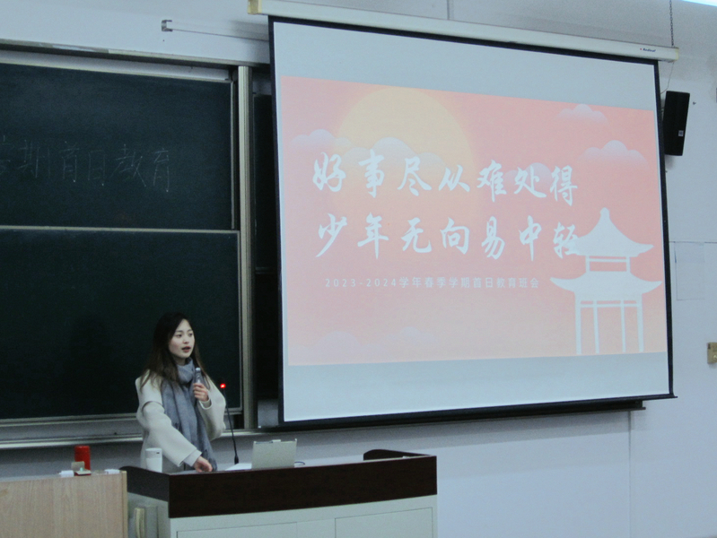 首日教育过程中,辅导员们各显身手推出了精彩纷呈的思想政治教育盛宴。国际法学院辅导员张妍以“好事尽从难处得,少年无向易中轻”为主题,带领同学们回顾寒假社会实践活动,邀请实践团队开展分享,从“大思政课”到“知行杯”,从老师引领到同学们主动思考、集思广益。警务学院辅导员刘震涛喊出“你永远来得及选择滚烫的人生”开场,他以春节档热门电影《热辣滚烫》及导演贾玲背后的故事为例,鼓励学生们在新的学期中树立正确的学习态度和人生观念。经济法学院辅导员席章瑾抛出“大学生活应该做加法还是减法”这一问题,从个人成长成才和身边变化的“小切口”中生动诠释了大学生成长的“大主题”。