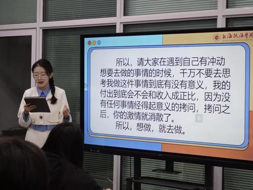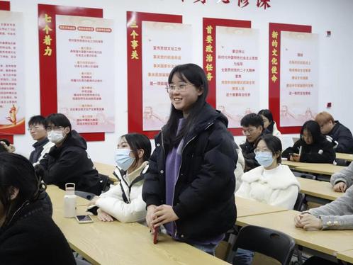 林容楚分享,这个“自己”的含义就在于去做你认为有意义的事情。她鼓励大家积极参加班级、院级、校级部门的各类工作,并分享了自己在担任人工智能法学院学生会主席组织活动中的经验;她支持同学积极申请志愿活动、支教活动,也分享了在“书信上政”“志愿青海线上支教活动”中难忘的故事;她和同学们分享备战经验,从组队选题到答辩展示,坚持做自己认为有意义的事就是我们的底气。她说:“不必考虑他人的目光,做自己认为有意义的事情,一定可以成为优秀的自己!”