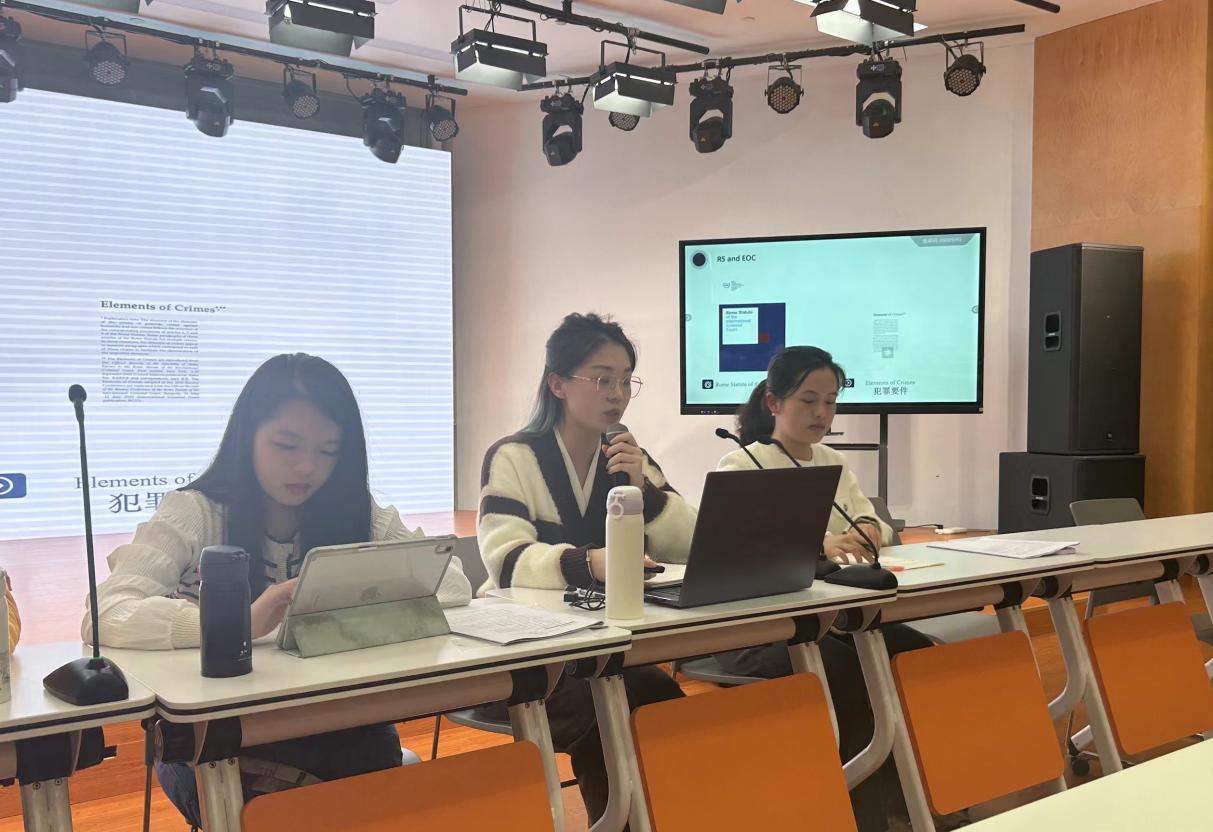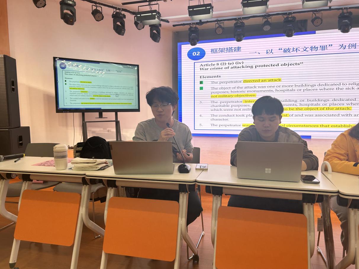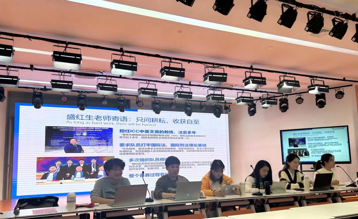 段伊旺同学介绍了国际刑事法院模拟法庭竞赛的基本情况,分享了本次比赛上政代表队各阶段取得的成绩,并以本次比赛赛题为例,讲述如何从论述结构和遣词造句等方面打磨比赛书状。同时,段伊旺还以问答互动的方式具体阐释在英文模拟法庭比赛书状选择词语时的技巧。