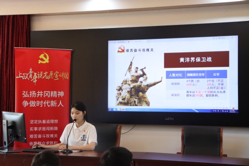 宣讲团成员分为四组以四个文物为线索,通过“青言青语”生动讲解“坚定执着追理想、实事求是闯新路、艰苦奋斗攻难关、依靠群众求胜利”这一井冈山精神核心要义和时代价值宣讲团成员通过生动形象地讲述趣味多彩的问答,吸引同学们用心聆听积极思考现场气氛十分活跃,宣讲收到了良好效果。