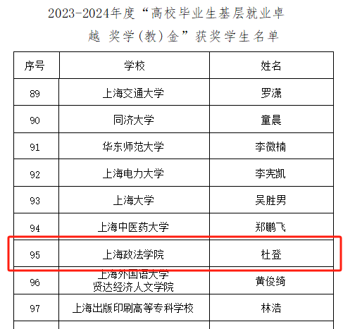 近日,教育部高校学生司转发了中国教育发展基金会《关于公布2023-2024年度“高校毕业生基层就业卓越奖学(教)金”获奖人选的通知》。我校2019级毕业生杜登荣获该奖项。
