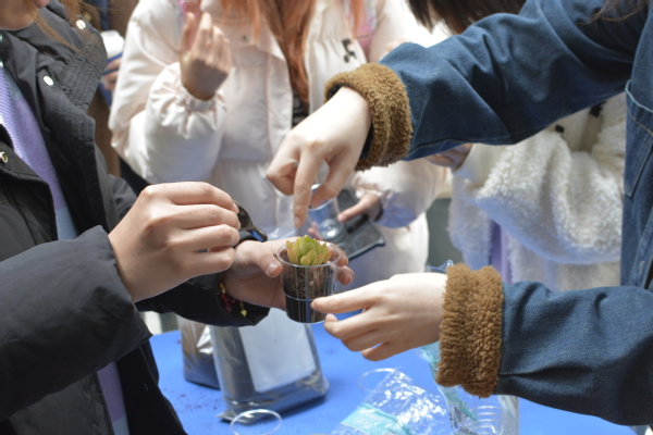 活动现场,一盆盆形态各异的多肉植物整齐排列,等待着同学们用咖啡渣为它们“安家”。现场同学兴奋地表示:“以前只知道咖啡渣可以用来除味,没想到还能种多肉,真是太神奇了!”在易班志愿者的指导下,同学们将咖啡渣与营养土按比例混合,小心翼翼地栽种多肉,打造出独一无二的“绿色艺术品”。