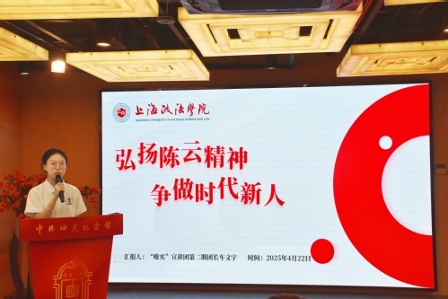 “唯实”宣讲团团长车文宇以上海市大学生红色文化创意大赛一等奖的实践案例出发,聚焦“弘扬陈云精神,争做时代新人”主题,从实践背景、设计思路、实践方法、实践成效、经验启示五个方面入手分享如何做好新时代红色文化传播者,希望宣讲团成员踏实深耕,彼此支持,共同将宣讲实践做得更扎实、更深入、更有温度。