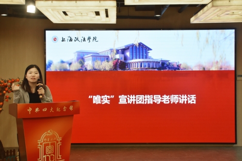 丁继珂老师为成员代表赠送带有“唯实”标志的书夹,希望每一位宣讲团成员都能在书海中汲取智慧,在实践中传播真理。颜涵老师阐释“唯实”来源,结合陈云同志“不唯上,不唯书,只唯实”精神内涵和上政“刻苦求实,开拓创新”校训,勉励同学们正确处理付出与回报、理论与实践、个人与集体的关系,在上海建设习近平文化思想最佳实践地过程中贡献上政青年力量,让党的创新理论“声”入人心。