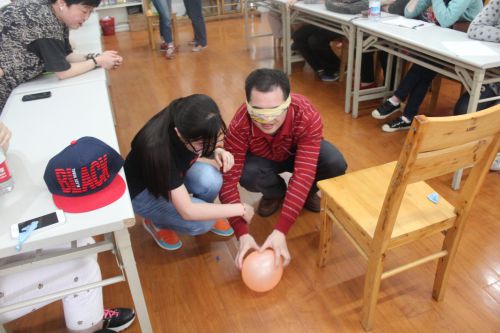 随后进行的合作游戏“盲人走路”则更受学员们的喜欢。志愿者将学员的眼睛蒙住,通过语言指引学员越过障碍物再踩破气球,由于气球并非固定,在蒙住眼睛的情况下经常踩空,使得游戏趣味十足,也吸引了更多的学员参与进来。志愿者们耐心引导,欢声笑语一直萦绕全场。