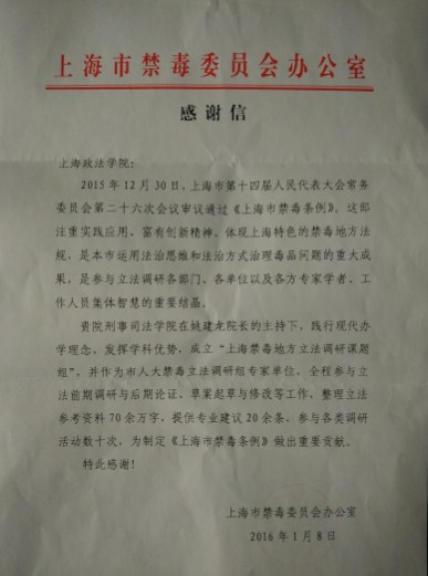 2016年1月13日,我院收到上海市禁毒委员会办公室发来的《感谢信》,对我院在姚建龙院长带领下为制定《上海市禁毒条例》做出的重要贡献表示感谢。