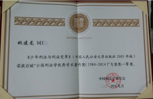 其中,我院院长姚建龙教授《少年刑法与刑法变革》(中国人民公安大学出版社2005年版)一书荣获首届“全国刑法学优秀学术著作奖(1984-2014)”一等奖。
