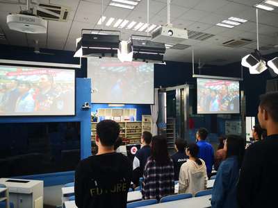 在场学生共唱国歌,仿佛身在北京人民大会堂现场。直播过程中,在场同学不时响起掌声。习近平总书记的讲话字字入目,声声入耳,句句入心。大会直播结束后,在场学生围绕大会讲话内容自发开展了讨论学习。