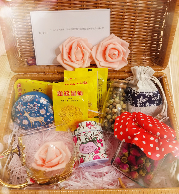 疫情防控的特殊时期,我们的女神们也迎来自己的节日。刑事司法学院分工会为全体刑司女教职工举行了一场特殊的慰问活动。一方面是举行线上送祝福活动:大家分别在线上沟通了工作和生活近况,分享了自己最近的照片,送上了对彼此的真诚祝福;另一方面,刑事司法学院分工会同时为全体女职工精心准备了贴心的小礼物---花茶,礼物通过快递形式送至每位女职工手上,希望每一位女教职工都能健康且乐观,生活像春天一样,明媚且美好。