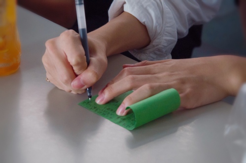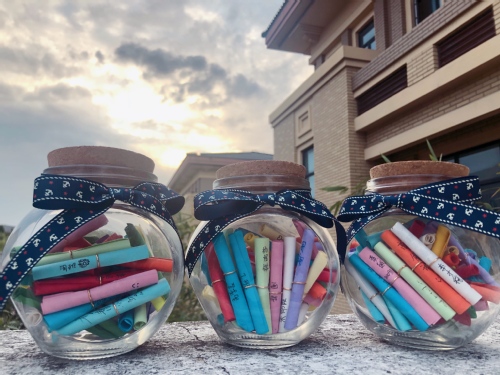 在心愿规划环节,伴随着《直到世界尽头》的热血音乐,裘欣璐下发心愿漂流瓶,同学们在彩色的纸片上,写下心愿理想,立下1年小目标和大学4年的总目标。小小的一张纸,承载着刑司青年对未来的无限憧憬。