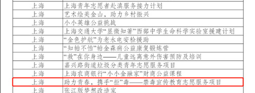 2020年9月29日,由共青团上海市委联合市文明办、市志愿服务公益基金会等单位主办的第二届“奉献杯”上海青年志愿服务项目大赛于上海青年管理干部学院举行。我院禁毒志愿服务项目“助力青春,携手‘拒’毒”成功突围,获第二届“奉献杯”上海青年志愿服务项目大赛铜奖,并获选全国赛终评入围项目,角逐全国赛奖项。